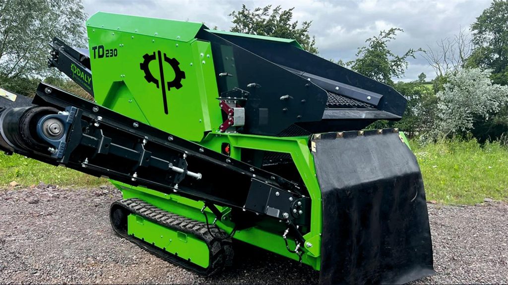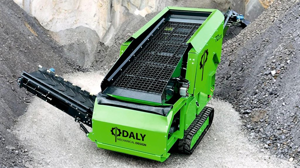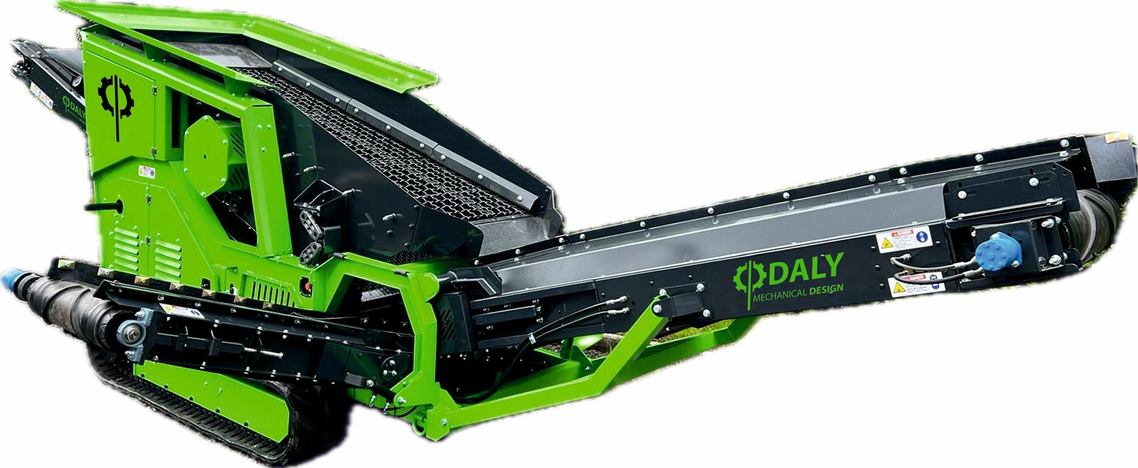 DALY TD330 (Chenilles – 3 Fractions) : Le fleuron de la gamme. Un crible 3-way split complet avec 3 convoyeurs de stockage intégrés. Il possède le plus grand étage de criblage de son secteur (3mx1.2m) pour une empreinte au sol minimale.